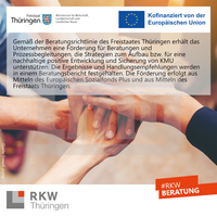Beschreibung des Vorhabens: Gemäß der Beratungsrichtlinie des Freistaates Thüringen erhält das Unternehmen eine Förderung für Beratungen und Prozessbegleitungen, die Strategien zum Aufbau bzw. für eine nachhaltige positive Entwicklung und Sicherung von KMU unterstützen. Die Ergebnisse und Handlungsempfehlungen werden in einem Beratungsbericht festgehalten. Die Förderung erfolgt aus Mitteln des Europäischen Sozialfonds Plus und aus Mitteln des Freistaats Thüringen